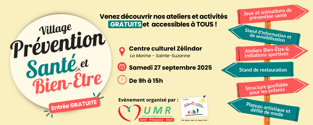 L’UMR, et son partenaire l’association Entre Parenthèses, organisent un Village Prévention Santé & Bien-Être le samedi 27 septembre 2025 au Centre Culturel Zélindor à La Marine, Sainte-Suzanne.